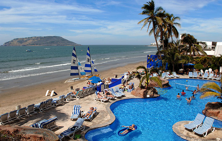 Agradable alberca frente al mar, que ofrece una espectacular vista a las icónicas 3 islas de Mazatlán, convenientemente climatizada de acuerdo a la temporada, y cómodamente equipada con asoleaderos, sombras y camas balinesas, además de ofrecer servicio de bar y snack bar para que goce del descanso reparador de un día de playa y diversión por cuenta de nuestro staff de actividades.