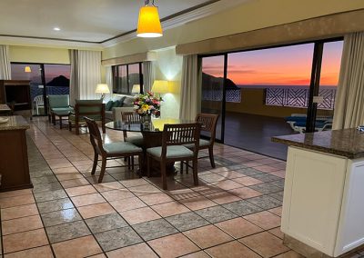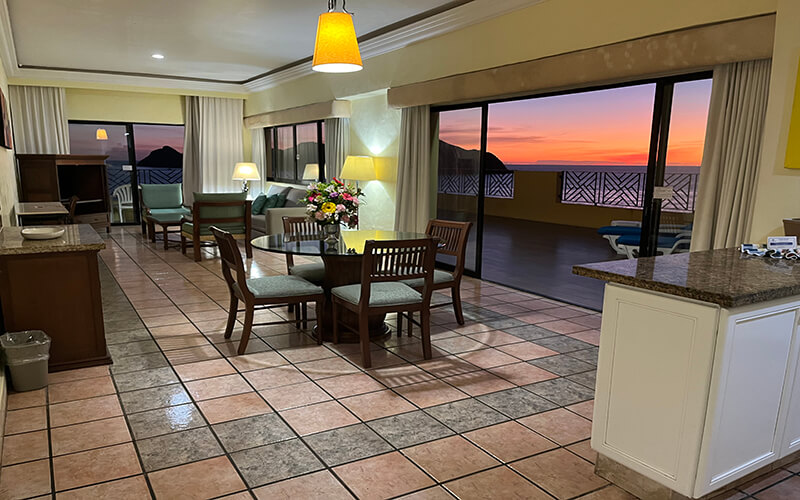 Esplendor, lujo y comodidad. Suite de una recámara con terraza y una espectacular vista al mar, con 2 camas matrimoniales, sofá-cama, sala comedor, cocineta totalmente equipada, 2 baños completos, 2 televisiones y 3 balcones con bella vista a las tres islas.